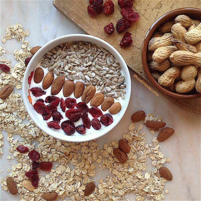 Por cima das papas de aveia polvilhe com canela, deite o mel e de seguida a mistura dos morangos com o iogurte. Depois disponha todos os outros ingredientes.